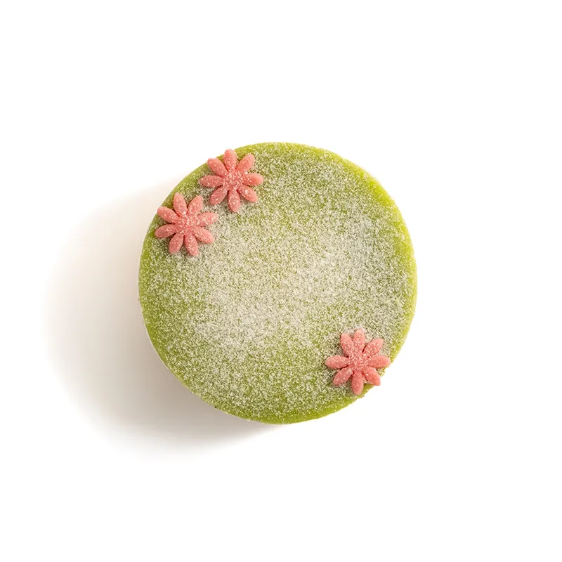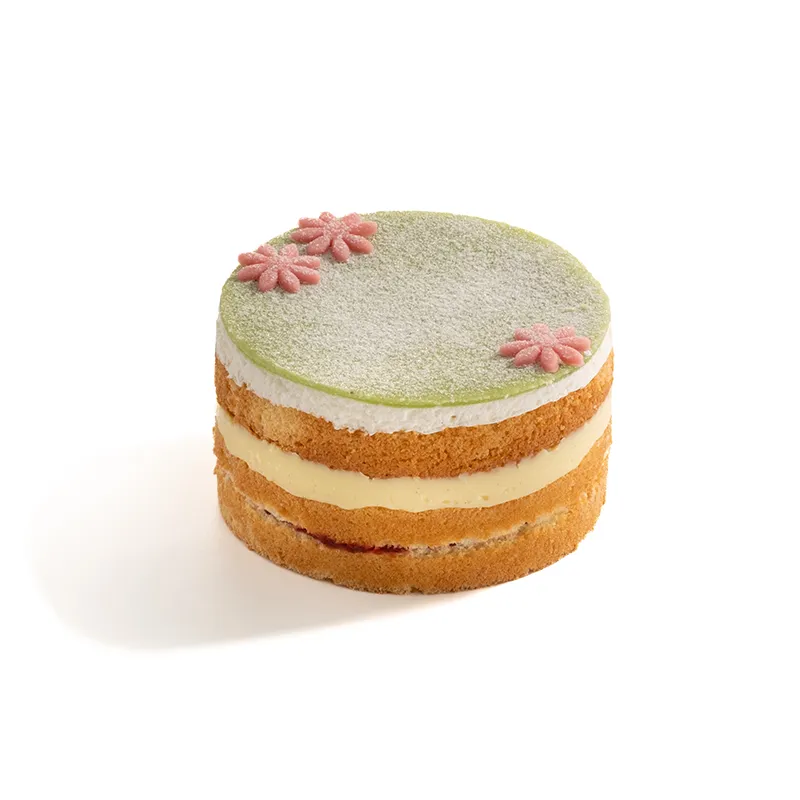مناسب برای 5 تا 6 نفر. قطر حدودأ 15 سانتی متر.لایههای کیک سبک ژنواز که در بین آن با کرم پتیسیر، خامه سبک شده و مارمالاد توتفرنگی پر شده و با مارزیپان خانگی سبز رنگ تزئین میشود.