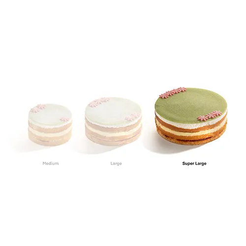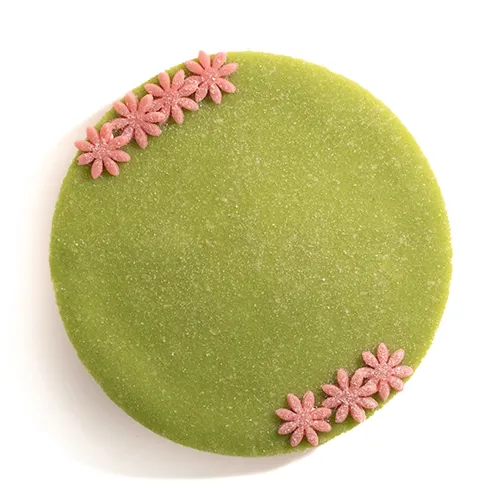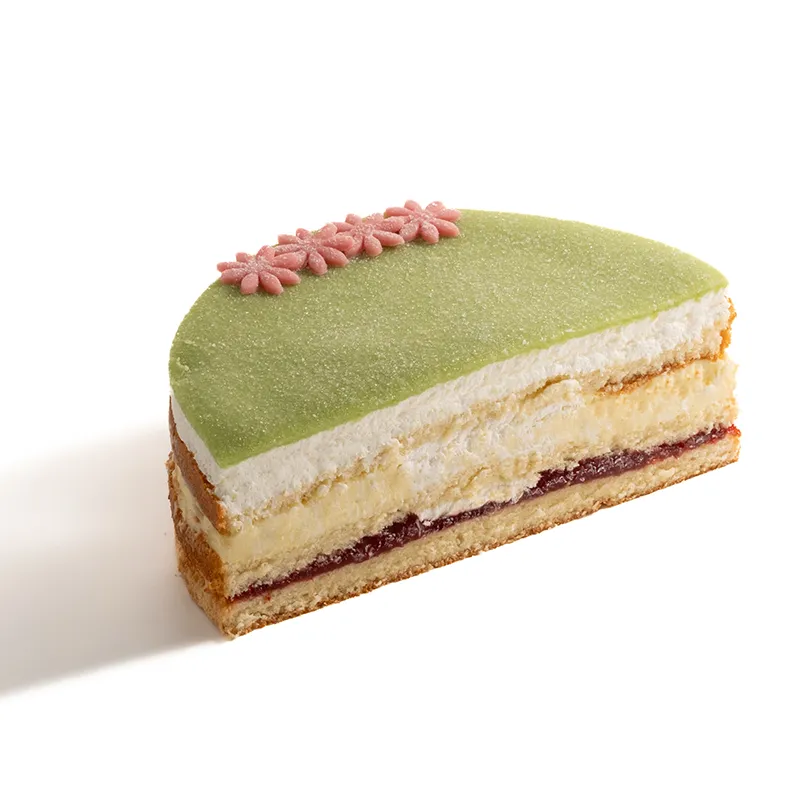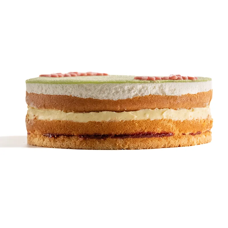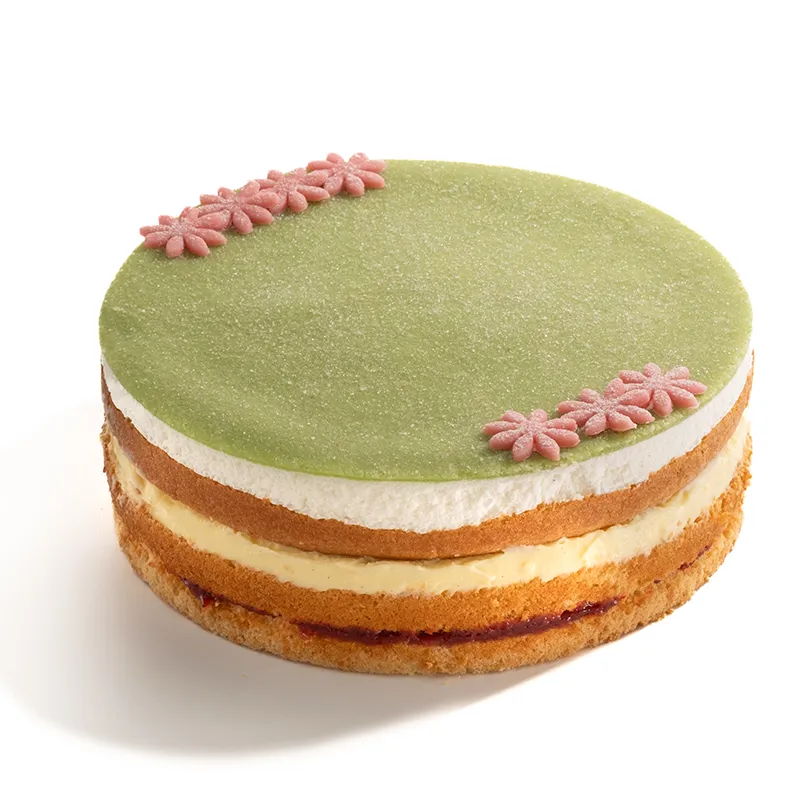 لایههای کیک اسفنجی سبک و لطیف که در بین آن با کرم پتیسیر، خامه سبک شده و مارمالاد توتفرنگی پر شده و با مارزیپان خانگی سبز رنگ تزئین میشود.